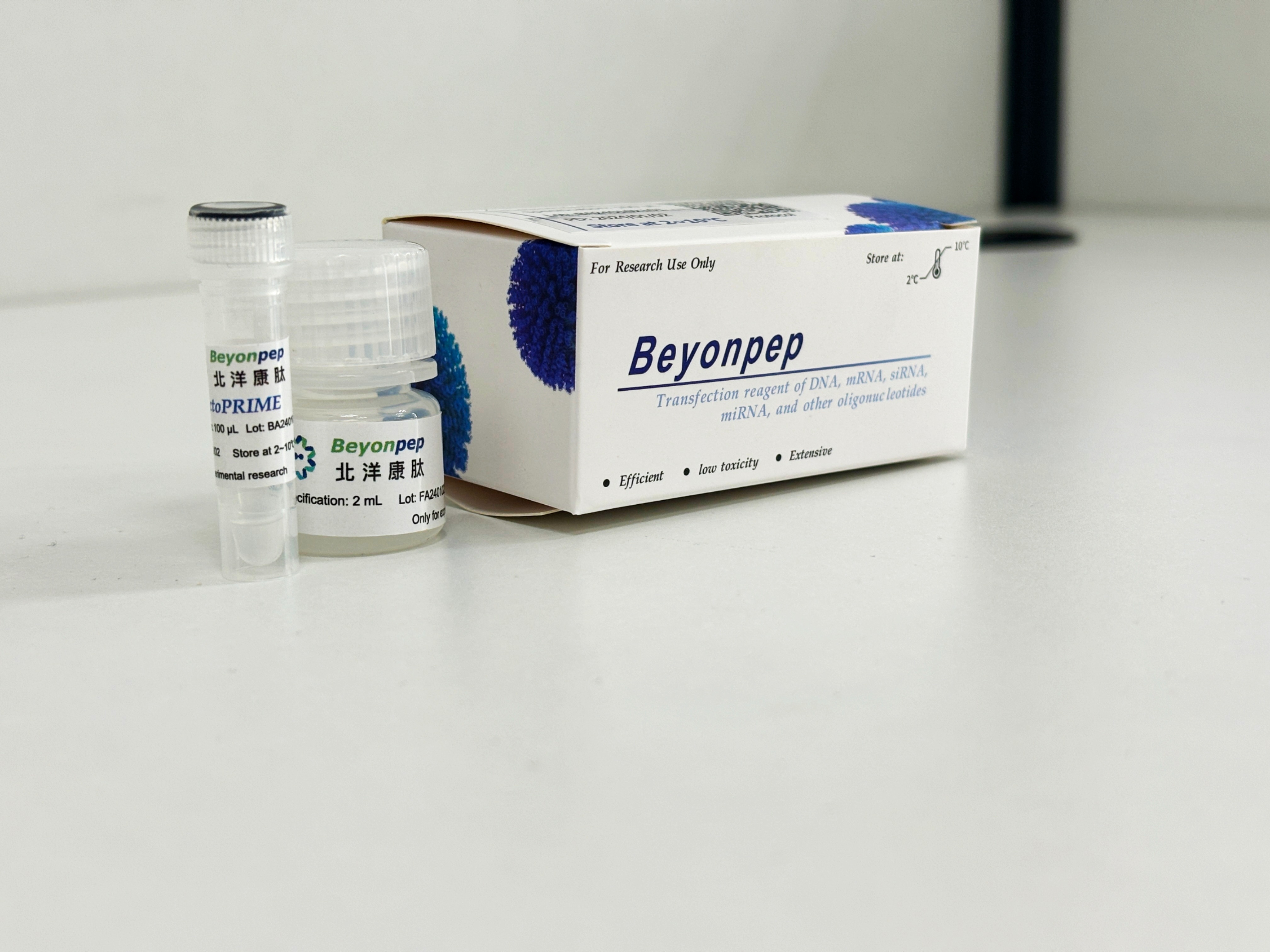 通常情况下,使用推荐用量,每毫升本试剂约可以转染6孔板40个孔、24孔板200个孔、96孔板1000个孔,15只小鼠(体量20 g)。