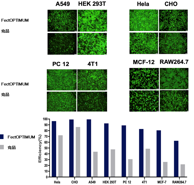 FectOPTIMUM递送mRNA至多种难转染细胞系均实现超高的阳性率和高效的mRNA表达。